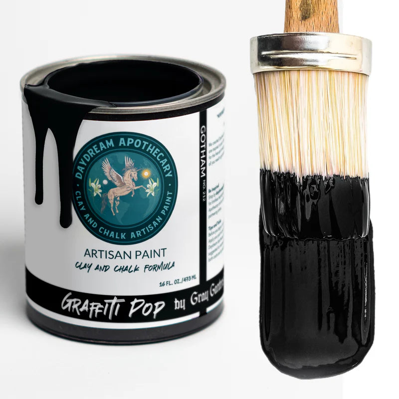 Graffiti Pop's Gotham Clay and Chalk Paint, a true black paint that brings edgy, artistic flair to your next project. Its versatility makes it easy to achieve the perfect look, using the product on almost any surface. Whether you're a pro or a beginner, enhance your artistry with Gotham!