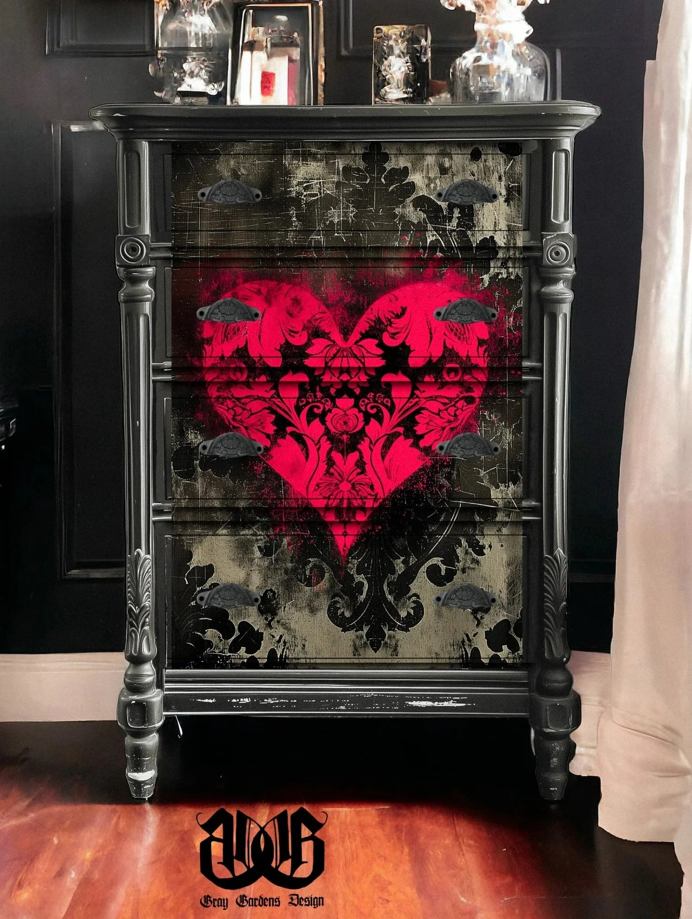 Introducing the Grunge Damask Heart Decoupage Tissue Paper! Are you a fan of the elegant beauty and timeless appeal of the damask pattern, combined with a grungy rustic look? Our Grunge Damask Heart Decoupage tissue paper is perfect for furniture upcyclers and DIY crafters looking to add a touch of sophisticated dark elegance to their creations. 🖤✨