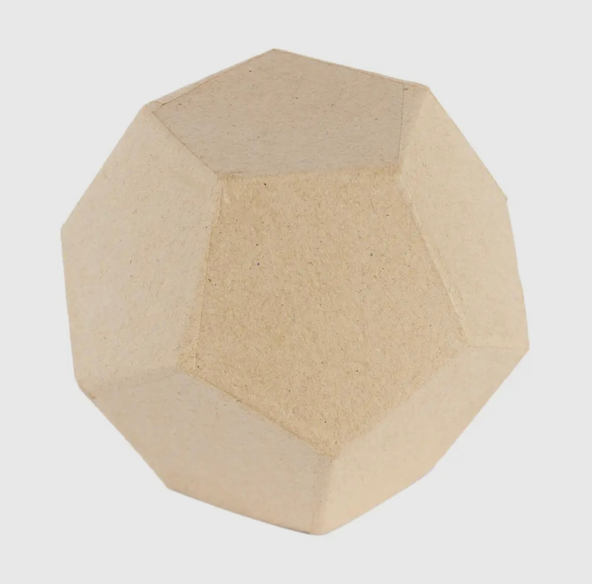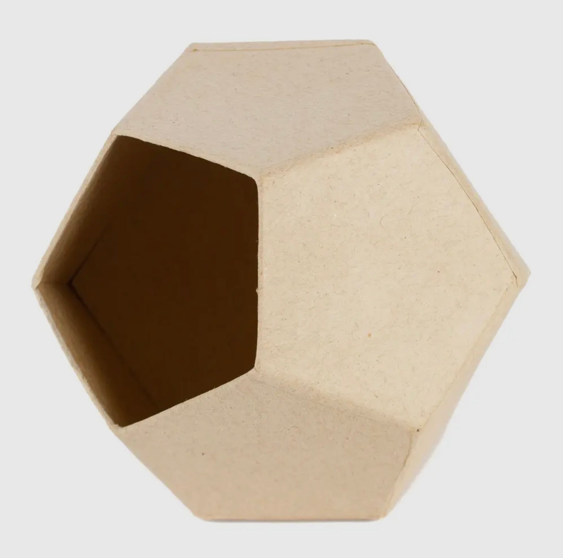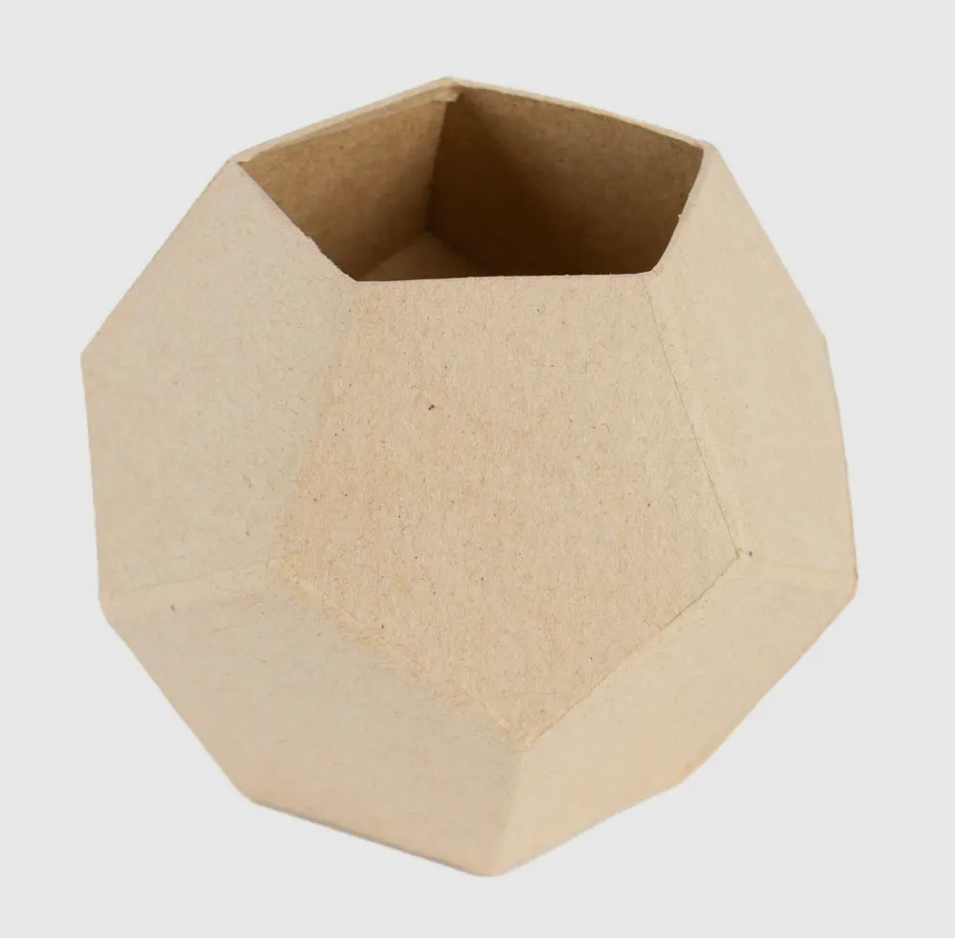 This Paper Mache Geometric Planter has a unique twelve-sided shape with an open side revealing a hollow interior, it is perfect for painting, staining, and embellishing to match any décor style. Ideal for displaying dried or artificial florals, this planter brings a modern touch to any space.