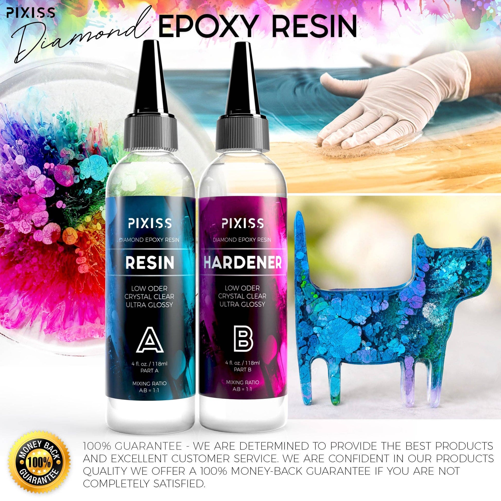 PIXISS Diamond Resin is crystal clear and cures with a high gloss finish. Non-toxic when cured, low odor, and self-leveling. With a temperature resistance of 150°C/300°F. PIXISS Diamond Resin has anti-yellowing properties making it the artist's choice for art projects, including tumblers, cutting boards, coasters, countertops, bartops resin art, resin jewelry, acrylic pouring, and more. EASY MIX 1:1 RATIO - Mix equal parts A Resin and B Hardener for 3-5 minutes. 30 minutes of work time. 24 hour cure time.
