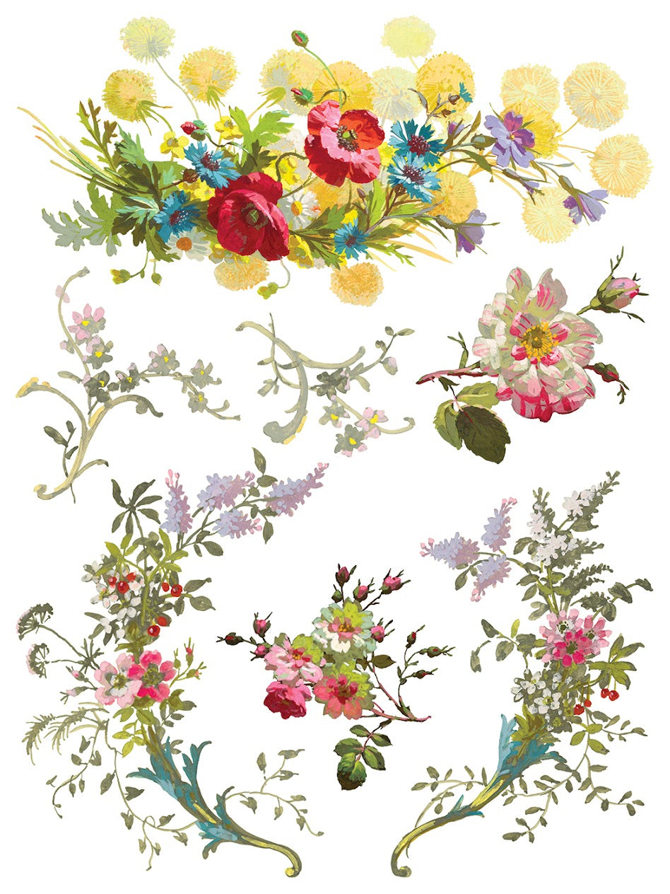 Meet the Saint Germain Transfer, a collection of gorgeous florals inspired by gouache paintings found in a book called Saint Germain Volumes 1 and 2.. The artist is unknown, but the blooms are a mesmerizing celebration of the floral form. With soft light and delicately contrasting shadows dancing across each bloom, this transfer is absolutely delightful.